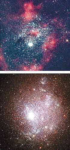 Рис.7. Наверху - объект Ходжа, внизу - компактная карликовая галактика NGC 1705. Оба объекта содержат сверхгигантские молодые скопления. Изображения получены на Космическом телескопе “Хаббл”.