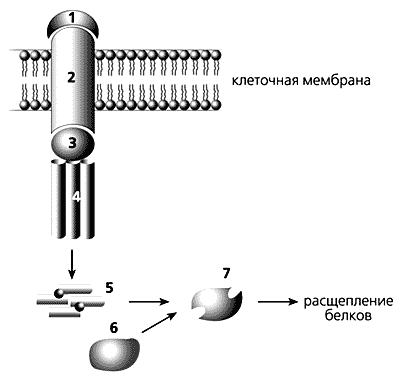Сигнальная молекула (1) связывается с “рецептором смерти” (2) и далее через адаптерный белок (3) - с прокаспазой-8 (4), после чего она превращается в активный фермент каспазу-8 (5). Она активирует в свою очередь прокаспазу-3 (6), которая, став действующим ферментом (7), расщепляет клеточные белки, и клетка погибает.У млекопитающих семейство каспаз состоит из 14 постоянно синтезируемых белков. Неактивная каспаза, или прокаспаза, построена из четырех частей: N-концевого домена, большой и малой субъединиц и короткой связующей области между ними. Чтобы прокаспаза превратилась в активный фермент, связующая область и N-концевой домен отщепляются, и образуется гетеродимер из большой и малой субъединиц. Из двух таких димеров и формируется активная каспаза. При апоптозе сначала активируются инициаторные каспазы (-2, -8, -9, -10, -12), а затем, с их помощью, эффекторные (-3, -6, -7). Эти последние расщепляют опорно-двигательные структуры клетки, подавляют биосинтез белков и приводят в действие эндонуклеазу - фермент, расщепляющий ДНК. Остальные каспазы (-1, -4, -5, -11, -13, -14) принимают участие в развитии воспалительных процессов, а также, наряду с эффекторными каспазами, в формировании эпителиальных клеток хрусталика, кератиноцитов (клеток верхнего слоя кожи) и т.д.После того как сигнальная молекула связалась с “рецептором смерти”, с помощью адаптерного белка к ним присоединяется прокаспаза-8. Став в результате этого работающим ферментом, она активирует прокаспазу-3, стоящую на пересечении двух путей запуска апоптоза - рецепторного и митохондриального. Роль каспазы-3 - расщепление опорных клеточных структур.