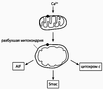 Органеллы, обеспечивающие жизнедеятельность клетки, обеспечивают и ее смерть. При сильном стрессовом воздействии (переохлаждении; нагревании; стимуляции образования АФК другими структурами клетки, помимо митохондрий; перекисном окислении липидов плазматической мембраны - чаще всего при облучении) в цитоплазме резко повышается концентрация ионов кальция. Если кальциевые депо клетки не справляются с его утилизацией, открывается так называемая митохондриальная пора диаметром 2.6-2.9 нм. Она представляет собой канал, проходящий через обе митохондриальные мембраны и состоящий из трех белков: транслокатора адениновых нуклеотидов, потенциалзависимого анионного канала (порина) и бензодиазепинового рецептора. Когда этот комплекс связывается с Са2+, через мембранную пору могут проходить вещества с небольшой молекулярной массой. Это приводит к падению мембранного потенциала и набуханию матрикса, целостность внешней мембраны неизбежно нарушается, и из межмембранного пространства в цитоплазму выходят белки апоптоза. Их несколько: фактор, индуцирующий апоптоз (APOptosis-inducing factor - AIF), вторичный митохондриальный активатор каспаз (second mitochondria-derived activator of caspases - Smac) и некоторые прокаспазы. Индуцирующий фактор направляется прямо в ядро, где вызывает деградацию ДНК.