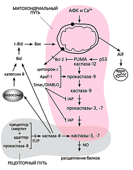 Под действием избытка ионов кальция митохондрия разбухает, через пору из нее выходит цитохром с и два белка - AIF и Smac. Первый белок индуцирует апоптоз, а второй активирует некоторые прокаспазы.Цитохром с может высвобождаться в ответ на повышение концентрации ионов Са2+, которое вызывает открывание поры. Но выход фермента “на свободу” может и не зависеть от этих ионов, тогда процесс контролируют белки семейства Bcl-2 (B-cell leukaemia-2 - лейкемия В-клеток-2). Именно они регулируют апоптоз на уровне митохондрий. Одни из белков этого большого семейства (Bcl-2, а также Bcl-xL, Bcl-w, Mcl-1, Al и Boo) предотвращают апоптоз; другие (Вах, Bad, Bok, Bcl-xS, Bak, Bid, Bik, Bim, Krk, и Mtd) способствуют самоубийству. Вот один пример работы белков этого семейства регуляторов. Цитозольный белок Bid расщепляется каспазой-8, активируемой через “рецепторы смерти”, и лизосомными протеазами катепсинами, чей выход из лизосом стимулирует эта же каспаза. Образовавшийся активный белок - усеченный Bid (truncated Bid - t-Bid) - изменяет конформацию другого проапоптозного белка, Вах, после чего тот встраивается во внешнюю мембрану митохондрий, где формирует комплекс с порином. Вместе они выстилают канал, по которому из межмембранного пространства выходят цитохром с и проапоптозные белки. Но если в дело вмешивается Bcl-2, действующий как антиоксидант, выход цитохрома блокируется.