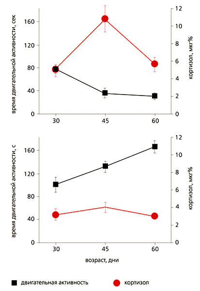 Рис. 6. Динамика двигательной активности исследовательского поведения и содержания кортизола в раннем постнатальном онтогенезе у обычных (вверху) и ручных лисят. Двигательная активность (черные линии), уровень кортизола (красные). Итак, мы узнали, что доместикация лисиц влечет за собой морфологические и физиологические изменения, гомологичные тем, что имеются у собак и других домашних животных. Наблюдая динамику появления новых признаков, мы стали свидетелями процесса, о котором раньше судили только по археологическим данным. Эксперимент с лисицами продемонстрировал, что при интенсивном отборе на приручаемость эти изменения могут возникать очень быстро и носить взрывной характер.