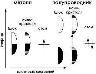 Заполнение электронных уровней в металле и полупроводнике. Энергетическая зона металла, независимо от размера его частиц, заполнена не вся, поэтому электроны могут переходить на более высокие уровни. У полупроводника же валентная зона заполнена целиком и отделена от зоны проводимости на 2—3 эВ. Из-за малых размеров полупроводниковых нанокристаллов эти зоны расщепляются, что приводит к эффективному увеличению ширины запрещенной зоны (до 4.5 эВ).
