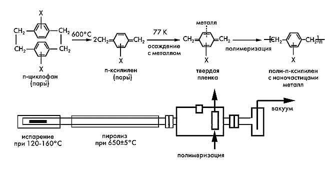 Молекулы п-циклофана, проходя через пиролизную зону ~600°С, превращаются в активный интермедиат, который осаждается на холодной подложке вместе с атомами металла или молекулами полупроводника. Затем в реакции термической полимеризации или фотополимеризации образуется поли-п-ксилилен (или его производные), а в полимерной матрице возникают неорганические наночастицы или кластеры размером от 1 до 20 нм (в зависимости от химической структуры предшественника и условий полимеризации). Частицы, характеризующиеся довольно узким распределением по размерам, в основном локализованы в аморфных областях полимера и организованы в сверхрешетку. А это обусловливает многие чрезвычайно важные электрофизические свойства нанокомпозита.