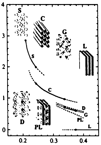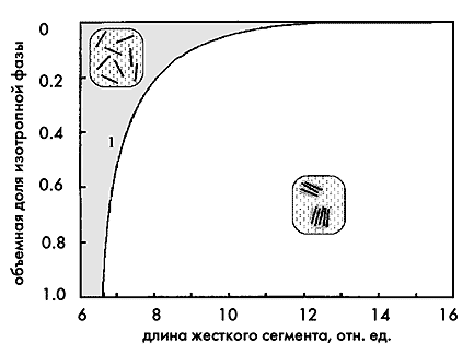 Фазовая диаграмма для системы, состоящей из молекул матрицы с гибкими цепями и полимера с жесткими стержнями. Смешение этих компонентов приводит к микрофазному разделению, причем объемная доля изотропной фазы (1) резко снижена в области больших длин жестких стержней (Flory P.J., Abe A. // Macromolecule. 1978. V.11. P.1122).В начале 80-х годов молекулярные композиты уже пытались получать, смешивая растворы жесткого и гибкого полимеров (например, полибензо-бис-тиазола и полибензимидазола в метансерной кислоте или полиамидимида и полиэфиримида в диметилацетамиде), которые образовывали тройную систему [18]. Оказалось, что фазовое поведение полимерного раствора жестких стержнеобразных молекул и гибкой матрицы зависит от энтропии смешения. Если она неблагоприятна, происходит микрофазное разделение компонентов, резко уменьшается объемная доля изотропной фазы по мере увеличения длины жестких сегментов. В результате значительно снижается усиливающий эффект по сравнению с системами, в которых жесткие сегменты распределены по всему объему матрицы случайным образом.