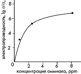 Проиллюстрируем еще и сенсорный эффект. Композитная пленка с наночастицами оксида свинца проявляет очень высокую чувствительность к аммиаку, содержащемуся в атмосфере [11]. В его присутствии электрическая проводимость пленки меняется на несколько порядков величины в области концентраций аммиака, измеряемых миллионными долями. Примечательно, что эти изменения обратимы: если аммиак удалить из атмосферы, проводимость пленки возвращается к исходной величине.