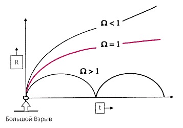 Точное современное значение параметра общей плотности материи W0 играет важнейшую роль при решении вопроса о пути эволюции Вселенной [2]. Если общее количество материи хотя бы немного меньше критической массы (W < 1), Вселенная будет расширяться постоянно, причем с ускорением, и галактики будут удаляться все дальше и дальше друг от друга (рис. 1). Однако материи во Вселенной может быть вполне достаточно (W = 1) для того, чтобы силы гравитационного притяжения между космическими объектами начали замедлять и остановили (асимптотически) это расширение. Или даже (если масса Вселенной окажется больше критической, W > 1) начали “сжимать” Вселенную, что в конечном итоге может привести к тоже Большому, но на этот раз — Схлопыванию).