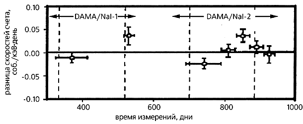 Рис. 6. Результаты эксперимента DAMA по поиску годовых модуляций WIMPs. Скорость счета NaI детекторов в интервале низких энергий в различные времена года приведена в зависимости от текущего времени начиная с 1 января первого года измерений. Вертикальными пунктирными линиями отмечены полугодовые периоды, соответствующие ожидаемым минимумам и максимумам сезонной вариации скорости счета WIMPs.Эксперимент проводится с использованием сцинтилляционных NaI детекторов общим весом около 100 кг в подземной лаборатории Гран-Сассо. Это первый и пока единственный положительный результат поиска частиц Темной Материи. Недавно опубликованные результаты другой коллаборации CDMS — эксперимент в настоящее время проводится в Стэнфорде (США) [13] с использованием низкотемпературных германиевых и кремниевых детекторов — не подтверждают положительного эффекта. Поэтому для окончательного вывода о регистрации WIMPs с такими характеристиками требуются дополнительные эксперименты. Кроме эксперимента CDMS сейчас ближе всех по чувствительности к результату DAMA подошли эксперимент IGEX-DM, проводимый одновременно в подземных лабораториях Баксан (Россия) и Канфранк (Испания), и эксперимент «Гейдельберг—Москва» в лаборатории Гран-Сассо. В обоих случаях используются полупроводниковые детекторы из сверхчистого германия общей массой порядка 10 кг.Новые эксперименты в Баксанской обсерватории