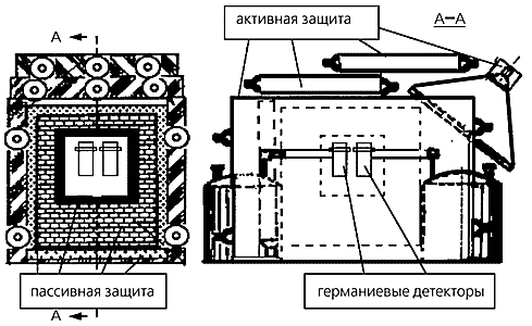 Рис. 7. Комбинированная (пассивная и активная) защита вокруг германиевых детекторов в баксанском эксперименте IGEX-DM.Эти меры позволили снизить фон детектирующей установки примерно в 106 раз по сравнению с незащищенными детекторами в наземной лаборатории. В ходе эксперимента достигнут порог регистрации 2 кэВ при сверхнизкой скорости счета 0.09 соб./ (кг·кэВ·сутки) в области низких энергий.