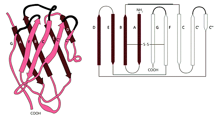 Исследования 80-х годов показали, что иммуноглобулины не одиноки в организме животных. Они лишь члены достаточно большой группы, включающей более 50 самостоятельных белков, подобных иммуноглобулинам, но обладающих не только иммунологической функцией. Группа получила название суперсемейства иммуноглобулинов, для которых характерны два свойства: статистически значимая гомология с иммуноглобулинами в последовательности аминокислот и особая, свойственная только им, структурная организация доменов (рис.5), обозначаемая как Ig-fold (иммуноглобулиновая складчатость).