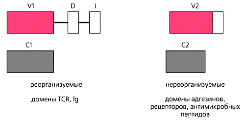 Основной вопрос эволюционной иммунологии как раз и состоит в том, чтобы понять, когда, как и зачем гомофильное взаимодействие сменилось на гетерофильное, т.е. нереорганизуемый V-ген стал реорганизуемым. Другими словами, что обеспечило эволюцию предковых V-доменов до современных форм, способных реагировать с множеством антигенов (патогенов).