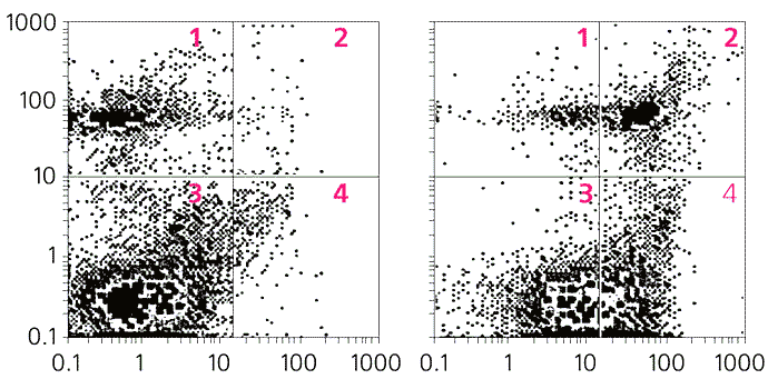 Следить за развитием апоптоза можно также, измеряя активность внутриклеточных каспаз, которые в клетке взаимно контролируют друг друга (рис. 3). Так, при связывании на клеточной мембране внеклеточных сигнальных молекул со специальным рецептором (CD95/Fas) в цитоплазме неактивная прокаспаза 8 превращается в активный фермент, который, в свою очередь, активирует каспазу 3, что открывает клетке путь к апоптозу. Нагружая клетки флуорогенным субстратом каспазы 3 и стимулируя их разными способами, можно измерять сигнал от флуоресцентного продукта. Растет продукт - активируется каспаза 3, и интенсивность сигнала будет пропорциональна активации фермента и вероятности развития апоптоза.Рис.2. Экспериментальные результаты индукции апоптоза и некроза в суспензии нейронов: в контроле (слева) и после 30 мин инкубации в присутствии 0.5 мМ NMDA (справа). Цифрами указаны субпопуляции нейрональных клеток: живые (3), апоптозные (4), подверженные легкому (1) и тяжелому (2) некрозу.