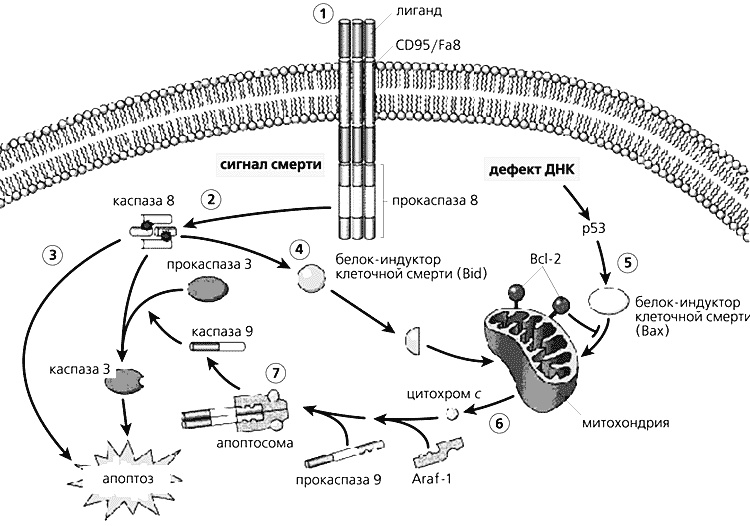 2 - высвобождение прокаспазы 8 и ее активация (сигнал клеточной смерти);