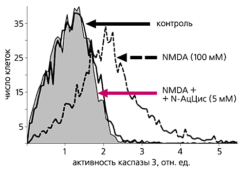 Экспериментально показано, что после длительной (30 мин) индукции окислительного стресса активацией NMDA-рецепторов появляются и некротические, и апоптозные клетки, причем их долю в популяции легко рассчитать (рис. 2). Таким образом, в руках исследователей имеется модель, позволяющая оценивать как потенциальную уязвимость нейронов со стороны различных факторов, так и возможность защиты клеток от апоптоза или некроза (например, с помощью лекарственных препаратов).
