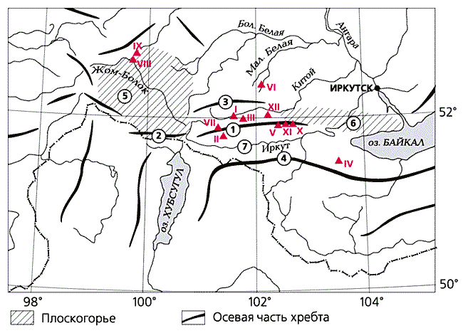Хребет Хамар-Дабан.В геологическом строении Юго-Западного Прибайкалья существенную роль играют карбонатные породы (преимущественно известняки), широко распространенные в Тункинских и Китойских Гольцах, Окинском плоскогорье. Различные формы поверхностного карста пространственно тяготеют к зонам интенсивной трещиноватости горных слоев вдоль активных разломов. Здесь ложа речных долин местами приобретают ступенчатый профиль. В обрамлении белоснежных каменных зубьев-останцов можно наблюдать небольшие, но живописные каскады (скажем, в верховьях р.Ара-Хонголдой, правого притока уже упомянутой Китой).