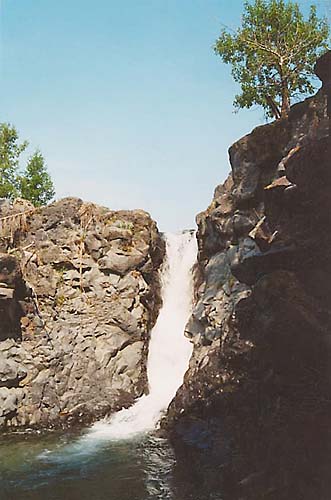 Наиболее интересны мощные каскады на реках, глубоко врезанные в долины. Самый известный - 22-метровый водопад - крупнейший из тех, которые когда-то отправился искать князь Кропоткин. Расположен он при впадении р.Жом-Болок в Оку, прорезающую глубоким (30 м) каньоном фронтальную часть голоценового лавового потока. Жом-Болок в нескольких километрах от устья разделяется на два рукава. Главный из них чуть ниже раздвоения русла врезается в базальты мощностью 20-25 м и пропиливает их до основания, не образуя водопадов. А узкий рукав - Бога-Жом-Болок, шириной не более 3 м (в паводок - до 8.5 м) и глубиной до 1 м, - течет по плоской поверхности застывшей лавы до отвесного края каньона и по дуге низвергается в него. Водоток активно смещается вверх по течению, и в базальтах выработалась глубокая (почти до уровня воды Оки), с уходящими вверх стенками промоина протяженностью около 100 м и шириной 40-50 м. В межень падающая вода не достигает эрозионного “котла”, орошая глыбовую осыпь. Однако в большие паводки ее масса способна выносить из промоины огромные (более 1 м3) базальтовые глыбы, лежащие на ее дне. Для местных жителей этот водопад - священное место.