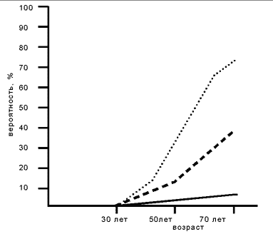 Существует еще одна, относительно новая, область применения знаний о выключении определенных генов-супрессоров опухолевого роста в процессе развития рака. Дело в том, что при хирургическом лечении рака единственную гарантию положительного результата обеспечивает лишь полное удаление всех пораженных участков. К сожалению, зачастую не так-то легко определить, затронут ли опухолью данный участок органа или здоров. Вероятность ошибки велика, а цена ее - огромна. В то же самое время многие органы нельзя удалять целиком - хирургическое вмешательство желательно ограничить. На выручку приходит сама мутация, испортившая ген-супрессор. Она служит прекрасным маркером присутствия опухолевых клеток. В хороших западных клиниках уже проводятся операции “под молекулярным контролем”. Выглядит это примерно так: видимая невооруженным глазом опухолевая ткань удаляется полностью, а по окружности через каждые несколько миллиметров берутся микроскопические пробы, которые с помощью молекулярно-генетических экспресс-методов исследуются в расположенной рядом лаборатории. Если какие-то опухолевые отростки оказались пропущенными при первом прикосновении скальпеля, их удаляют через два часа после анализа. Средняя продолжительность жизни пациентов после “контролируемой” операции значительно выше, чем у оперированных обычным образом. А главное - не так уж редки случаи, когда операция, сделанная на ранней стадии заболевания, приводит к полному излечению.Вероятность развития рака молочной железы или яичников для женщин разного возраста. Сплошная кривая - мутации гена BRCA1 не обнаружено; штриховая - рак молочной железы у нескольких близких родственников (тестирование не проводилось), пунктирная - унаследована мутация гена BRCA1.Еще раз напомним: семейные случаи заболевания раком составляют всего лишь несколько процентов от всех пациентов онкологических клиник. С одной стороны, это хорошо - не так уже много людей с замирающим сердцем следят за своей молекулярной судьбой. Но посмотрим на проблему с другой стороны - пациенты, осведомленные о риске развития опухоли конкретного типа, заботятся о своем здоровье, а значит, менее подвержены “обычным” - но не менее опасным - заболеваниям, которые сваливаются на прочих граждан как снег на голову. Кроме того, семейные случаи злокачественных заболеваний однородны по составу мутаций, повреждающих гены-супрессоры, поэтому легко поддаются ранней диагностике и даже профилактическому лечению. А вот спорадические опухоли, развивающиеся под действием факторов окружающей среды, изменчивые по своей природе, не так просто обнаружить. Для большинства таких опухолей не найдено никакого генетического изменения, однозначно указывающего на то, что процесс злокачественного роста уже запущен. Некоторые распространенные разновидности онкозаболеваний - к примеру, рак легких у курильщиков - вообще не имеют специфичного гена-супрессора. К появлению опухоли в этом случае приводит целый ряд генетических изменений, ни одно из которых не встречается у других больных. Генетическая сложность не позволяет провести ни раннюю диагностику, ни подобрать специфическое лечение. Потому-то рак легких и остается одним из самых опасных злокачественных заболеваний.