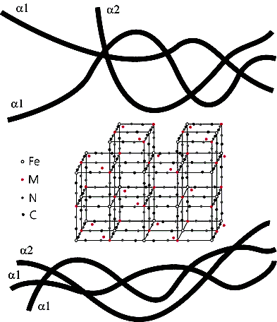 Схема строения желатиновой матрицы с иммобилизованным металл- гексацианоферратом(II). Этот комплекс может насчитывать от единиц до нескольких десятков молекул M2[Fe(CN)6] и зажат между участками молекул желатина, каждая из которых состоит из переплетенных между собой полипептидных цепей - a1 и a2.
