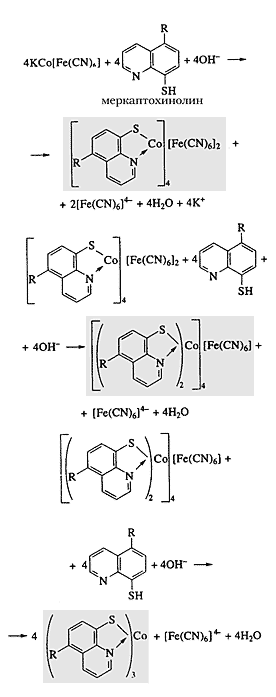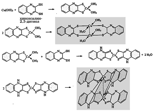 Образование комплексных соединений при взаимодействии иона никеля с дитиоксамидом в желатиновой матрице. Здесь и далее такие соединения выделены цветом.Как легко заметить, данные по комплексообразованию в этой системе подтверждают справедливость прогноза о возможности формирования в ее специфических условиях комплексов с дефицитом лиганда (Ni2L)2[Fe(CN)6], координационных полимеров [NiL(OH2)2]n и хелатов с выраженным дефицитом протонов NiL(OH2)2, [NiLHL]–. Перечень систем ион металла—лиганд, для которых комплексообразование в желатиновой матрице с иммобилизованным МГФ открывает новые синтетические возможности, этим примером отнюдь не исчерпывается. Так, взаимодействием в ней ионов Cu(II) с хиноксалин-2,3-дитиолом могут быть получены два димерных хелата, Co(III) с 8-меркаптохинолином — три координационных соединения, два из которых — интермедиаты.