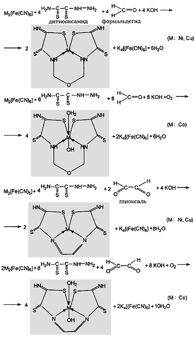 Без сомнения, самое резкое отличие этого процесса от образования координационных соединений в растворе (или твердой фазе) наблюдается в системе ион металла—лиганд, где металл — это, скажем, двухвалентный никель, а лиганд L — дитиооксамид H2N-C(=S)-C(=S)-NH2. Результаты анализа кинетических кривых комплексообразования, химического анализа и традиционных физических методов исследования свидетельствуют, что если этот процесс протекает в желатиновой матрице с иммобилизованным МГФ, то синтезируются минимум пять (!) координационных соединений, причем разного цвета. В стилизованной форме их можно записать как (Ni2L)2[Fe(CN)6] (зеленовато-серый), NiL(OH2)2 (розово-фиолетовый), [NiL(OH2)2]n (фиолетовый), [Ni(HL)2]n (темно-синий) и [NiLHL]– (бесцветный), где HL– и L2– — одно- и двукратно депротонированная форма лиганда дитиооксамида. Примечательно, что NiL((OH2)2 при pH<5 быстро и необратимо переходит в [Ni(HL)2]n. Если эту же реакцию комплексообразования проводить в растворе или твердой фазе, образуется лишь одно координационное соединение [3] — [Ni(HL)2]n.