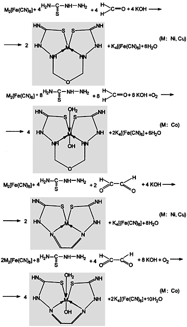 Комплексообразование в желатиновой системе, по сравнению с таковым в растворе или твердой фазе, имеет еще большие преимущества в темплатном синтезе (т.е. из фрагментов), во всяком случае в одном из его вариантов, сопровождающемся внутримолекулярной дегидратацией. Крайне малый реакционный объем, в котором происходит комплексообразование, и протонодонорная способность желатина обеспечивают как большее сближение молекул реагирующих веществ и их избирательную ориентацию по отношению друг к другу, так и повышение подвижности протонов в молекулах образующихся промежуточных комплексов. Первым примером такого синтеза было взаимодействие иона металла (Ni,Cu) с дитиооксамидом и формальдегидом, протекающее с образованием темно-коричневых макроциклических хелатов. Позднее выяснилось, что в качестве металла может быть использован и кобальт (причем в этом случае темплатный синтез сопровождается переходом Co(II) ® Co(III)), формальдегид заменен на глиоксаль, ацетальдегид или ацетон, а дитиооксамид — на тиосемикарбазид. Замечательно, что темплатный синтез с использованием указанных органических соединений в растворе или твердой фазе требует как минимум повышенной (60°С) температуры, тогда как в МГФ-системе для него хватает и комнатной [4].