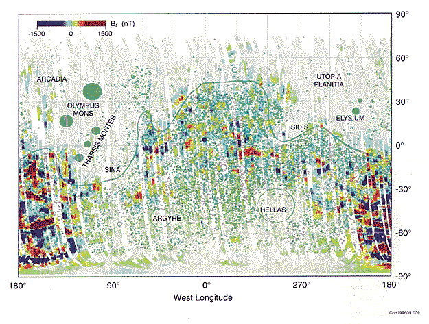 Распределение магнитного поля, окружающего Марс,