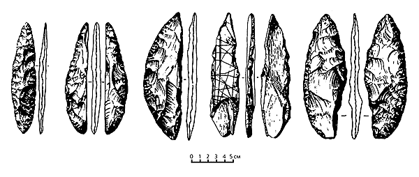 Дюктайские каменные наконечники копий и ножи.Продолжение исследований в Якутии привело к еще более сенсационным находкам. На высоком, выше 100 м, берегу Лены, близ впадения в нее ручья Диринг-Юрях, были найдены необычайно архаичные каменные изделия. Проведенные на огромной площади раскопки выявили в гравийном слое массу орудий из кварцитовых галек. Первооткрыватель памятника Мочанов увлекся теорией так называемой “внетропической прародины” человечества, приписывая Дирингу совершенно фантастическую древность (более 1.8 млн лет), сопоставимую с возрастом самых ранних стоянок Африки. Недавно группа американских ученых сумела получить серию датировок, позволяющих примерно определить возраст отложений с культурными остатками. Опубликованные цифры (от 250 тыс. до 350 тыс. лет), конечно, не столь впечатляют, как первоначально заявленные миллионы, но и такая датировка заставляет нас пересмотреть сложившиеся представления о расселении предков человека. Это время соответствует максимальному, самаровскому, оледенению Сибири, когда мощные ледники перегораживали течение Лены, образуя здесь гигантскую запруду. Обнаружение столь древнего памятника в Северо-Восточной Азии говорит о реальности освоения этой территории уже в нижнем палеолите и принципиальной возможности проникновения человека в Берингию.