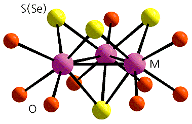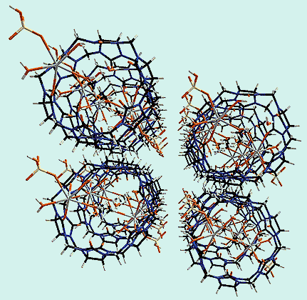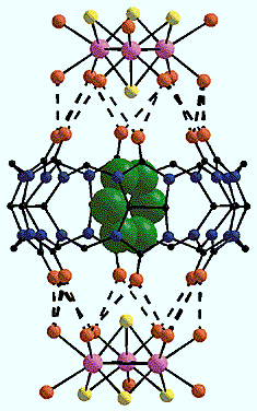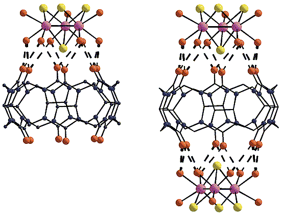 Трехъядерные координационные кластеры [M3Q4(H2O)9]4+ (M = Mo, W; Q = S, Se).Для создания прочных супрамолекулярных соединений необходимо как совпадение размеров “крышки” и “бочки”, так и образование между ними развитой системы водородных связей. Экспериментальные исследования подтвердили, что кластеры [M3Q4(H2O)9]4+ и кукурбитурил прекрасно отвечают обоим этим условиям. В результате удалось получить “бочки” двух типов: с одной “крышкой” и с двумя. Размеры таких супермолекул составляют 15 и 25 A соответственно. “Крышка” плотно закрывает “бочку” кукурбитурила с одной или с обеих сторон, а шесть молекул воды кластера соединяются с атомами кислорода портала максимально возможным числом водородных связей - 12 (!), благодаря чему строительные блоки прочно удерживаются вместе. Супрамолекулярные комплексы, полученные в виде красивых кристаллов из смеси разбавленных растворов исходных соединений - кукурбитурила и кластеров, - уже более не растворяются ни в воде, ни в кислотах [12-19].