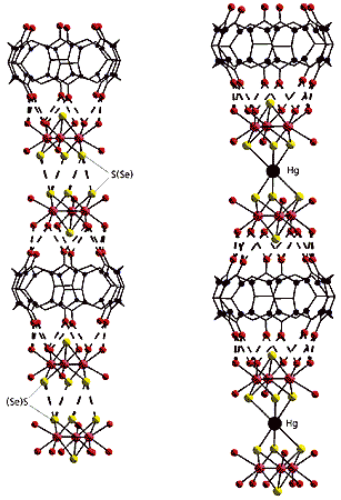 и контакты между атомами халькогенов.Характернейшая особенность слоистых дихалькогенидов металлов - способность включать между слоями халькогена “гостей”: атомы металлов или малые молекулы. Такое внедрение приводит к раздвиганию слоев и позволяет целенаправленно менять свойства материалов. Атомы серы (или селена) трехъядерных кластеров могут, например, координировать атомы ртути [16-18]. Важно, что при этом размеры и геометрия треугольного кластерного фрагмента практически не меняются, а значит, он также способен взаимодействовать с кукурбитурилом и образовывать супрамолекулярные соединения. В них атом ртути координируется через атомы селена к “крышкам” соседних супермолекул кукурбитурила, связывая их в бесконечные цепочки. За счет включения ртути расстояние между атомами селена увеличивается так же, как в слоистых дихалькогенидах металлов при интеркалировании “гостей” между слоями. Эти результаты наглядно показывают, что химия твердого тела гораздо теснее связана с химией молекулярных кластеров, чем можно было ожидать. Даже вторичные эффекты, например нековалентные взаимодействия между атомами халькогена, служат важным фактором в образовании структуры как для создания неорганических материалов (дихалькогенидов переходных металлов), так и для упаковки изучаемых нами супермолекул.