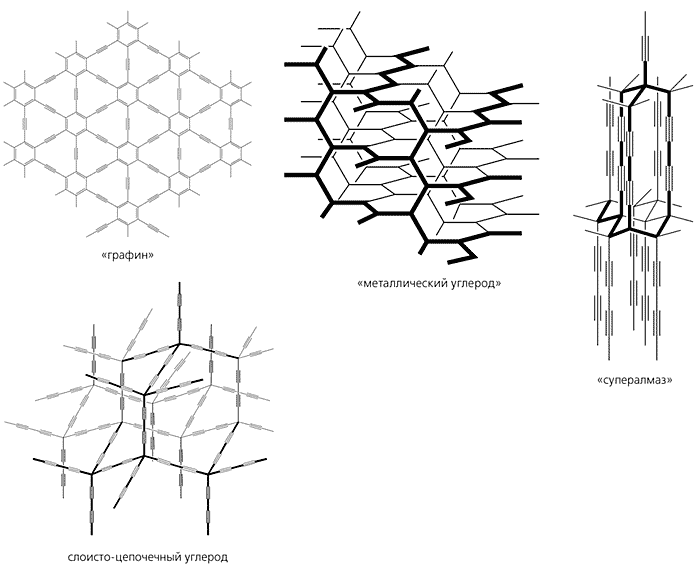 В первую группу следует включить “аморфный”, алмазоподобный и стеклообразный углерод, а также сажу, кокс и подобные им материалы. Такие формы со смешанным ближним порядком состоят из более или менее случайно организованных атомов углерода различной гибридизации. К этой же группе могут быть отнесены также многочисленные гипотетические структуры (рис. 2): графины, некоторые полициклические модификации в виде трехмерных углеродных сеток, “металлический углерод” и сходные с ними структуры на основе алленовых (=C=C=) или диацетиленовых (–CBC–CBC–) фрагментов, которые расположены между ортогональными полиеновыми или полидиацетиленовыми цепочками. “Супералмаз” и слоисто-цепочечный углерод (т.е. гибридные карбино-алмазные структуры, в сущности представляющие собой частный случай одномерного “супералмаза”) тоже относятся к смешанным формам углерода. Методологические основы синтеза таких форм подробно рассмотрены в исчерпывающих обзорах Ф.Дидериха и И.Рубина [10, 11].