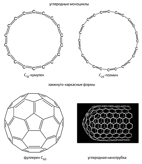 Рис. 3. Промежуточные формы углерода: углеродные моноциклы и замкнуто-каркасные структуры.