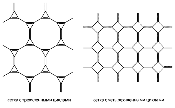 Дробная степень гибридизации в промежуточных формах - следствие изогнутости и напряженности углеродного скелета. Например, в молекуле C60, наиболее детально изученного члена семейства фуллеренов, она равна 2.28 [14]. Некоторые гипотетические формы в виде полициклических углеродных сеток могут быть тоже приписаны к промежуточным при условии, что они содержат напряженные циклы (рис. 4).