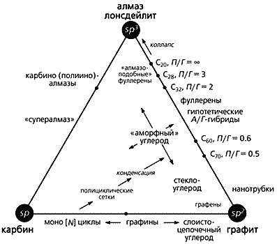 Приведенные здесь аллотропные формы углерода укладываются в созданную нами общую схему классификации и родственную ей, более наглядную, третичную диаграмму (рис. 5). И та и другая основаны на типе гибридизации валентных орбиталей углерода. Эта диаграмма объединяет в себе основные аллотропные формы (существующие и предполагаемую), а также все переходные (как смешанные, так и промежуточные). В вершинах треугольника располагаются алмаз (вместе с лонсдейлитом), графит и карбин, а по сторонам и внутри - переходные формы.