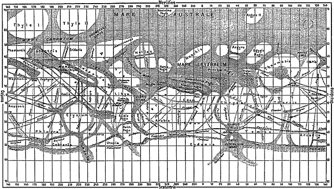 Карта Марса из книги К.Фламмариона “Живописная астрономия”.