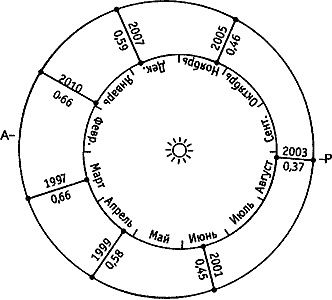 Зарисовки одного и того же полушария Марса, выполненные разными астрономами на протяжении двух с половиной столетий. Темная деталь в центре рисунков - самое заметное пятно на Марсе, открытое еще Х.Гюйгенсом. На картах Дж.Скиапарелли это треугольное пятно названо Большим Сиртом (Syrtis Major), как средиземноморский залив у побережья Ливии (на нынешних картах - Залив Сидра). Исследования Марса с космических аппаратов показали, что Большой Сирт действительно самая темная область на Марсе; но это не морской залив, а горное плато. Противостояния Марса с 1997 по 2010 г. Вдоль орбиты Земли (внутренняя окружность) указаны месяцы ее прохождения по данному участку. У орбиты Марса (наружная окружность) указаны точки ее перигелия (Р) и афелия (А). На линиях, соединяющих планеты в момент противостояния, указан год и минимальное расстояние до Марса в астрономических единицах.Однако великое противостояние 1909 г. принесло разочарование сторонникам марсианской цивилизации: новые крупные телескопы и близкое расположение космического соседа позволили провести великолепные наблюдения, подорвавшие веру в искусственные каналы. Особенно отличился при этом французский астроном греческого происхождения Эжен Антониади (1870-1944). Благодаря своим обширным данным, полученным на прекрасном большом телескопе в Медонской обсерватории под Парижем, он показал, что каналы представляют собой неправильные темные полосы, образуемые отдельными пятнами различной величины.В дальнейшем Антониади вернул Марсу интерес широкой публики, обнаружив, что эта планета все же не совсем мертвая: во время противостояния 1924 г. он в течение четырех ночей наблюдал светящиеся выбросы на краю ее диска, над областью Эллада. Все ожидали следующего великого противостояния 1939 г. Именно к нему и были подготовлены книги о Марсе, фрагменты из которых мы приводим ниже, - “Жизнь на других мирах” Королевского астронома (т.е. директора Гринвичской обсерватории) сэра Хэрольда Спенсера Джонса (1890-1960), а также “Планета Марс и вопрос о жизни на ней” московского профессора Иосифа Федоровича Полака (1881-1954). Исследования тех лет повернули интерес ученых к атмосфере Марса. А после 1964 г., когда стали доступны детальные снимки, переданные с межпланетных аппаратов, и никаких каналов на них не оказалось, эта проблема была забыта, хотя и не решена.