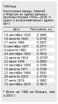 В конце августа 2003 г. как раз и случится великое противостояние Марса. Более того - величайшее, ибо столь тесного сближения наших планет не было еще на памяти человечества. Конечно, в эпоху космических полетов подобные события не играют уже той роли, какую они играли в прошлые столетия для астрономов, изучавших Марс с поверхности Земли. С противостояниями прошедших двух веков связаны