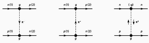Непосредственно сразу же за работой Ферми И.Е.Таммом [6] и Д.Д.Иваненко [7] была независимо высказана гипотеза о том, что короткодействующее взаимодействие между нейтроном и протоном в ядре может осуществляться за счет обмена парой электрон-антинейтрино по схеме * n ® p+(e– n' ) и (e– n') + p ® n (см. рисунок).