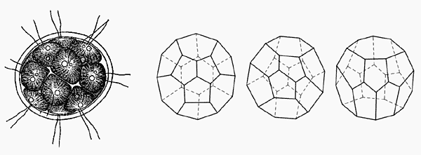 геометрически дуальные простейшему фуллерену - додекаэдру.В 1936 г. советский математик и механик Д.Д.Мордухай-Болтовской в “Записках Ростовского государственного университета” опубликовал обширную работу под громким, но заслуживающим того названием “Геометрия радиолярий”. По систематичности и тщательности проработки проблемы она не превзойдена до сих пор. Впрочем, правильнее будет сказать, что она практически забыта вместе с именем автора. Для нас здесь важно то, что на рисунках среди прочих форм можно видеть все те же фуллерены (рис.2). Статья начинается словами “правильные формы в природе объясняются экономией материала”. К этой мысли мы еще вернемся.