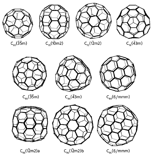Рис. 4. Потенциально стабильные фуллерены диапазона С60 - С100.