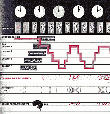 Ночной сон человека. Видно, что в течение ночи проходят четыре цикла сна, причем они неравнозначны: в первую половину ночи преобладает глубокий медленный сон, а в утренние часы - парадоксальный, сопровождаемый сновидениями. Смена поз характерна до и после каждого периода парадоксального сна (выделены цветом), который сопровождается интенсивной психической активностью, движением глаз и активностью нейронов ретикулярной формации ствола.Вероятнее всего необходимым и достаточным признаком сна можно считать ритмичность, т.е. чередование определенных физиологических признаков (полиграфических картин), позволяющих отличить нормальный сон от монотонных “сноподобных состояний”. Соответственно и критерием “нормальности” сна служит циклическое чередование стадий 1-2-3-4 медленного сна, которое завершается парадоксальной фазой. На основе такого подхода современное определение сна звучит следующим образом: это “особое генетически детерминированное состояние организма человека (и теплокровных животных, т.е. млекопитающих и птиц), характеризующееся закономерной последовательной сменой определенных полиграфических картин в виде циклов, фаз и стадий” [1].