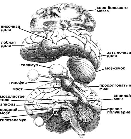 Как сейчас ясно, таких систем тонической деполяризации, или активации мозга (условно “центров бодрствования”), несколько - вероятно, пять или шесть. Располагаются они на всех уровнях мозговой оси: в ретикулярной формации ствола, в области голубого пятна и дорзальных ядер шва, в заднем гипоталамусе и базальных ядрах переднего мозга. Нейроны этих отделов выделяют медиаторы - глутаминовую и аспарагиновую кислоты, ацетилхолин, норадреналин, серотонин и гистамин, активность которых регулируют многочисленные пептиды, находящиеся с ними в одних и тех же везикулах. У человека нарушение деятельности любой из этих систем не компенсируется за счет других, несовместимо с сознанием и приводит к коме.