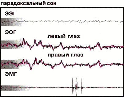 Фрагменты полиграммы на разных стадиях сна. Видно, что для смены стадий медленного сна характерно постепенное увеличение амплитуды и снижение частоты волн ЭЭГ, смена быстрых движений глаз медленными, вплоть до полного исчезновения (ЭОГ регистрируется на фоне ЭЭГ и выделены цветом), прогрессивное уменьшение амплитуды ЭМГ. При парадоксальном сне ЭЭГ такая же, как при бодрствовании, ЭОГ демонстрирует быстрые движения глаз, а ЭМГ почти не регистрируется.Видимо, при этом интенсивно перерабатывается информация, полученная в предшествующем бодрствовании и хранящаяся в памяти. Согласно гипотезе Жуве, в парадоксальном сне, пока непонятно как, в нейрологическую память передается наследственная, генетическая информация, имеющая отношение к организации целостного поведения. Подтверждением таких психических процессов служит появление в парадоксальном сне эмоционально окрашенных сновидений у человека, а также обнаруженный Жуве с сотрудниками и детально исследованный Э.Моррисоном с коллегами феномен демонстрации сновидений у подопытных кошек [10]. Они выяснили, что в мозге кошек имеется особая область, ответственная за мышечный паралич во время парадоксального сна. Если ее разрушить, подопытные кошки начинают показывать свой сон: убегать от воображаемой собаки, ловить воображаемую мышь и т.д. Интересно, что “эротические” сны у кошек никогда не наблюдались, даже в брачный сезон.