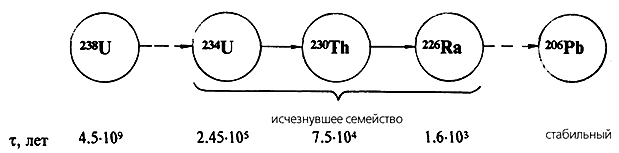 В составе океанической воды присутствует 2.5Ч10–9 г/л урана. При его распаде образуется семейство радиоактивных элементов 234U, 230Th, 226Ra и др. со своими периодами полураспада (Рис. 1). Согласно закону радиоактивного распада, нетрудно определить равновесные концентрации этих изотопов. Однако исследования показали, что в океанической воде содержится только несколько процентов от их ожидаемого количества. Урановое семейство исчезло. Вскоре его отыскали в океанических илах [2], причем дефицит в воде оказался в точности равен обнаруженному избытку в илах. Выяснилось, что радиоактивные изотопы уранового семейства прекрасно сорбируются океаническими взвесями и глинами. Это явление послужило основой применения избыточных (неравновесных) радиоактивных изотопов для датировки океанических осадков.