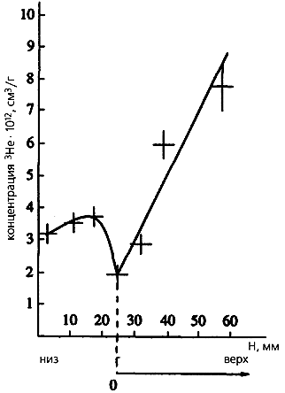 Рис. 4. Распределение концентрации изотопа 3Не по высоте колонки, вырезанной из железомарганцевой конкреции. Ветвь графика 0 - низ в сравнении с ветвью 0 - верх демонстрирует эффект самоэкранирования.