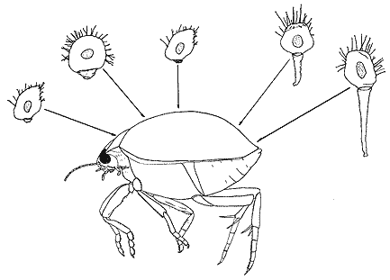 На разных участках верхней поверхности тела водного жука Hyphydrus ovatus сосущая инфузория Discophiya lichtensteinii имеет разную длину стебелька. Оказалось, что это связано с характеристиками гидродинамического пограничного слоя.Несколько лет назад автору этих строк удалось собрать около 30 экземпляров водяных жуков Hyphydrus ovatus из разных биотопов. Надкрылья жуков были густо покрыты инфузориями-сукториями Discophrya lichtensteinii. Даже визуально было заметно, что размер инфузории зависел от места ее расположения: чем ближе к заднему концу тела жука, тем длиннее был ее стебелек. Естественно было предположить, что такая закономерность связана с распределением гидродинамических нагрузок по поверхности надкрыльев. Необходимые расчеты помог выполнить сотрудник Института гидромеханики В.А.Кочин. Действительно, длина стебелька сукторий оказалась достоверно связана с параметрами пограничного слоя. Проанализировав опубликованные в научной литературе сведения об изменчивости размеров инфузорий в зависимости от их локализации, мы окончательно утвердились в своем предположении. И тогда нас стали интересовать не столько сами факторы, действующие на организмы в пограничном слое, сколько механизмы их адаптации к этим факторам [2]. Оказалось, что пограничный слой как биотоп имеет определенную структуру независимо от типа субстрата, что позволило рассматривать его в качестве комплекса потенциальных местообитаний, т.е. своеобразной адаптивной зоны сидячих простейших [3].
