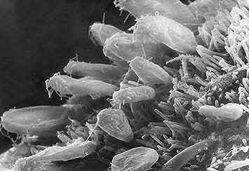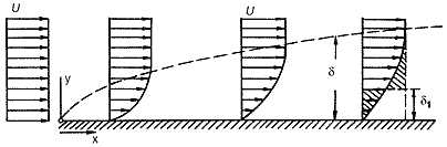 Электронные микрофотографии суктории Discophrya elongata на ноге водного клопа Ranatra linearis. У верхней поверхности ноги (слева) направление потока, видимо, относительно постоянно, поэтому инфузории наклонены в одну сторону. Увел. ґ600. У другой части той же ноги (справа), вероятно, возникают турбулентные вихри, соответственно здесь сукториям трудно “сориентироваться”, и они расположены хаотично. Увел. ґ200.Структура пограничного слоя как адаптивной зоныЧтобы не навлечь на себя гнев читателя-физика, сразу оговорюсь: употребление физического понятия “пограничный слой” в качестве адаптивной зоны в какой-то степени биологическая вольность. Как известно, существуют два подхода к определению размера пограничного слоя. В одних случаях принимается, что эта зона начинается там, где скорость течения на 1% (или 5%) меньше скорости потока окружающей жидкости, в других — на расстоянии от обтекаемой поверхности, на которое отклоняются линии тока жидкости (толщина вытеснения) [4]. Отдельно рассматривается так называемый диффузный пограничный слой. Все эти величины в нашем случае представляют интерес как составляющие пространственной структуры адаптивной зоны. Поэтому в дальнейшем речь пойдет о слоях, размер которых по нормали к поверхности совпадает с той или иной толщиной (диффузного пограничного слоя, толщиной вытеснения и т.п.), а не о величинах, принятых в гидродинамике.