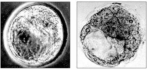 Рис.2. Эмбрионы мыши на четвертый день развития: контроль (слева) - нормально развитый зародыш; опыт (справа) - зародыш с патологиями, вызванными введением ПХФА на второй день беременности самок. Видны полость (бластоцель) и очень крупные по сравнению с контролем клетки трофобласта (наружного клеточного слоя).Снижение уровня эндогенного серотонина на ранних постимплантационных стадиях активного органогенеза (когда меняется тип питания зародыша и формируется плацента) приводило к недоразвитию плодов, образованию мозговых и пупочных грыж, микроофтальмии, расщелинам твердого нёба (рис. 3). В результате микроскопического исследования были выявлены другие патологические изменения в центральной нервной системе плодов: обширные кровоизлияния в разных отделах мозга (в продолговатом мозге, полосатом теле и в сосудистых сплетениях желудочков).