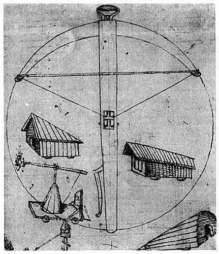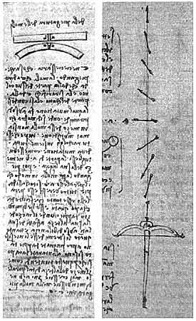 Теоретический подход к конструированию арбалета представлен на этом рисунке неизвестного автора, обнаруженном в рукописи, относящейся к позднему средневековью и известной под названием "Гуситские войны". Изображенный на рисунке арбалет имеет идеальную геометрическую форму. Спусковой механизм находится в центре круга, тетива (хорда) делит радиус пополам. Такой идеализированный подход к конструированию можно считать одной из отправных точек в дальнейших исследованиях Леонардо да Винчи по теоретической механике.Не имея четкого представления о таких понятиях, как инерция, сила и ускорение, Леонардо да Винчи, естественно, не мог найти окончательного ответа на этот вопрос. На страницах его рукописи встречаются рассуждения противоположного характера: в некоторых из них он склонен ответить на этот вопрос положительно, в других - отрицательно. Интерес Леонардо да Винчи к этой проблеме привел его к дальнейшим попыткам усовершенствовать конструкцию арбалета. Это говорит о том, что интуитивно он догадывался о существовании закона, впоследствии получившего название "закон сложения сил".