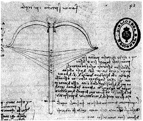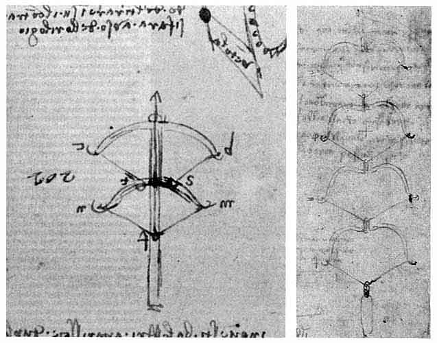 Арбалеты с измененной конструкцией дуги, предложенные Леонардо да Винчи. Он, по-видимому, нигде не дал объяснения, почему в этих арбалетах используются обратные дуги, а угол тетивы столь мал, особенно у арбалета справа, в котором применены блоки. Исходя из тех рукописей Леонардо да Винчи, где говорится об арбалетах, можно предположить, что такая конструкция дуг позволяет передавать энергию от дуги к тетиве более эффективно.