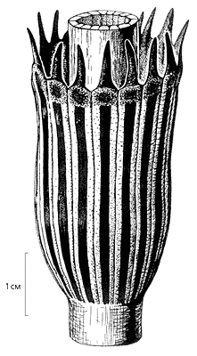 В представительном разрезе пермских отложений, расположенном по берегам (в основном, на левобережье) р.Кожим в Печорском Приуралье, мне посчастливилось найти крупный членистый ствол, явно относившийся к черновиевым. К узлам ствола прикреплялись облиственные побеги, на концах некоторых из них сохранились спороношения. После нескольких часов работы молотком и зубилом более полуметра ствола оказались свободными от скальной породы. По соотношению его диаметра и скорости уменьшения толщины удалось вычислить высоту растения - она должна была превышать 3.5 м. Эта находка послужила основой для первой графической реконструкции целого растения, названного Paracalamitina striata, из семейства черновиевых [4]. Прежде существовавшие реконструкции касались отдельных частей побегов [5] и спороношений [6] некоторых других представителей черновиевых.