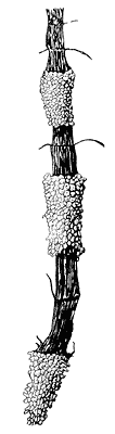 Фрагментация известна и у некоторых ископаемых членистостебельных. Отпечатки укорененных побегов, берущих начало от фрагмента более крупного побега, обломленного в узлах, часто встречаются палеоботаникам. Но вот спороношения такого древнего хвоща практически не попадаются в ископаемом состоянии. Вероятно, причина кроется не в том, что не все органы растения оказываются в одном захоронении. Не исключено, что в тех условиях было гораздо выгоднее размножаться вегетативным путем, охватывая своими клонами значительные пространства, в том числе и непригодные для других растений.